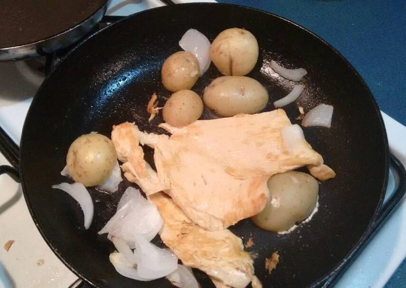 - Cuando estén medio doradas agrega las patatitas partidas por la mitad y la cebolla. Deja que se termine de dorar todo.