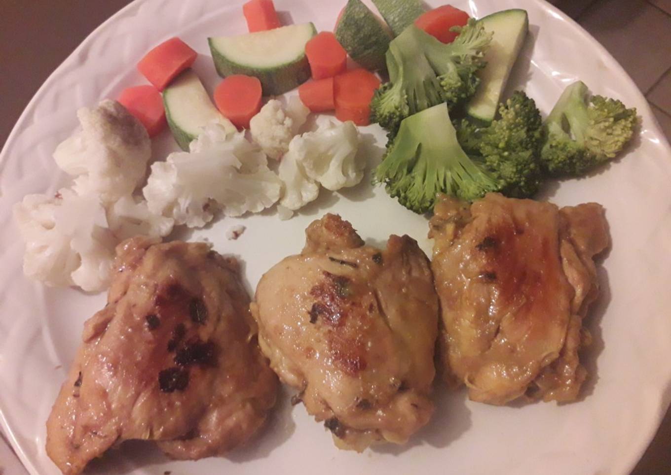 - Limpia tus muslos de piel y grasa, agrega sal pimienta, salsa inglesa, catsup, orégano, mostaza, limón, frota muy bien, mete al refri a marinar, por 3 horas, saca calienta aceite, agrega el pollo la cebolla arriba rebanada y tapa, cada 10 minutos voltear. y así hasta que se cuezan y dore un poco..