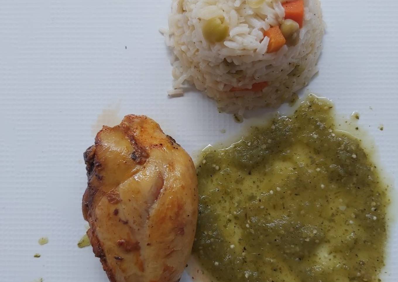Pierna de pollo al horno con salsa verde y guarnición de arroz